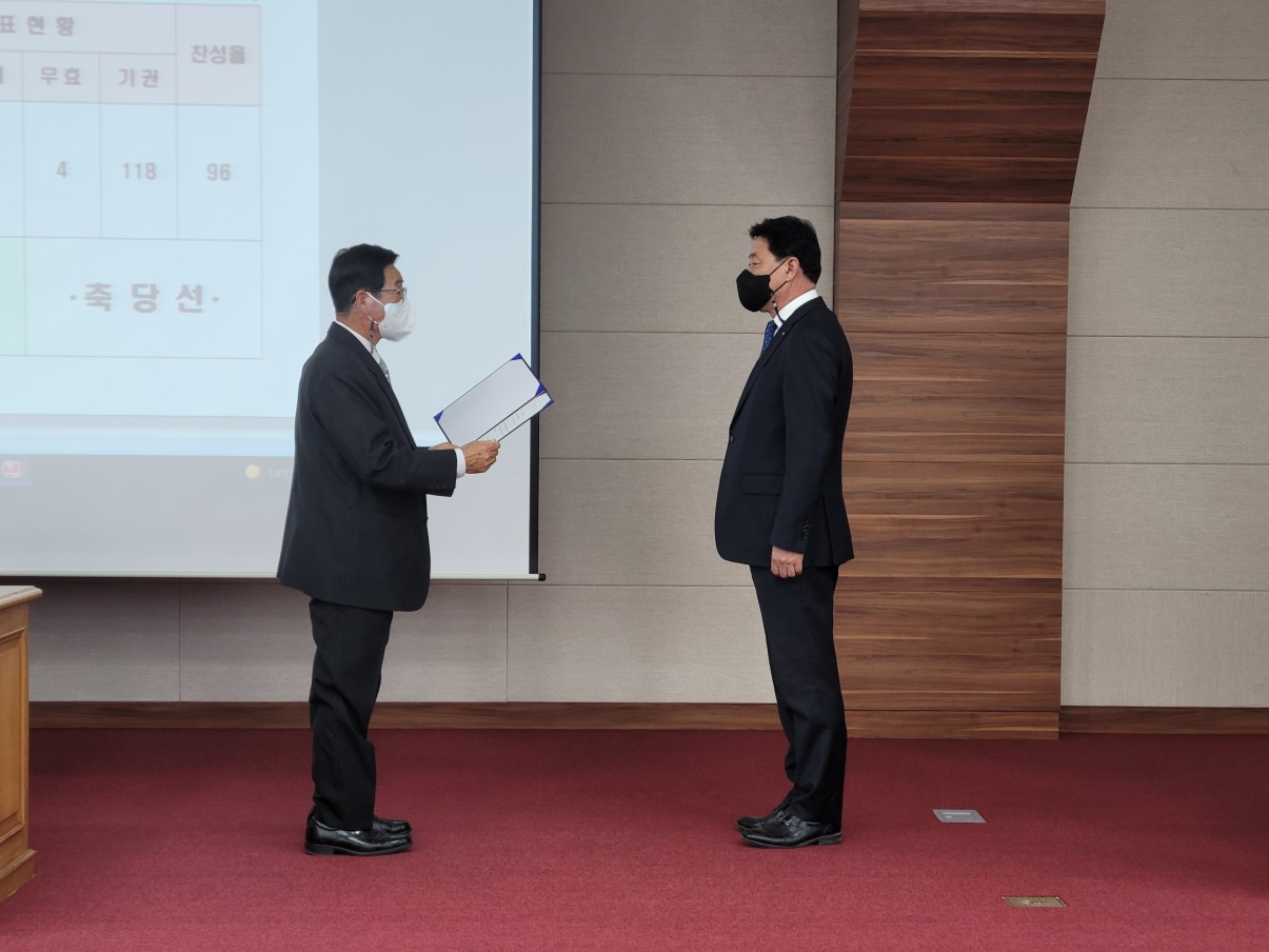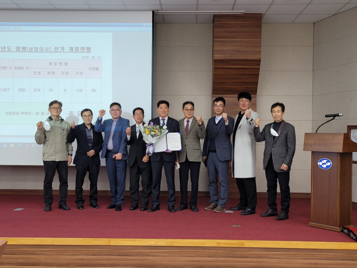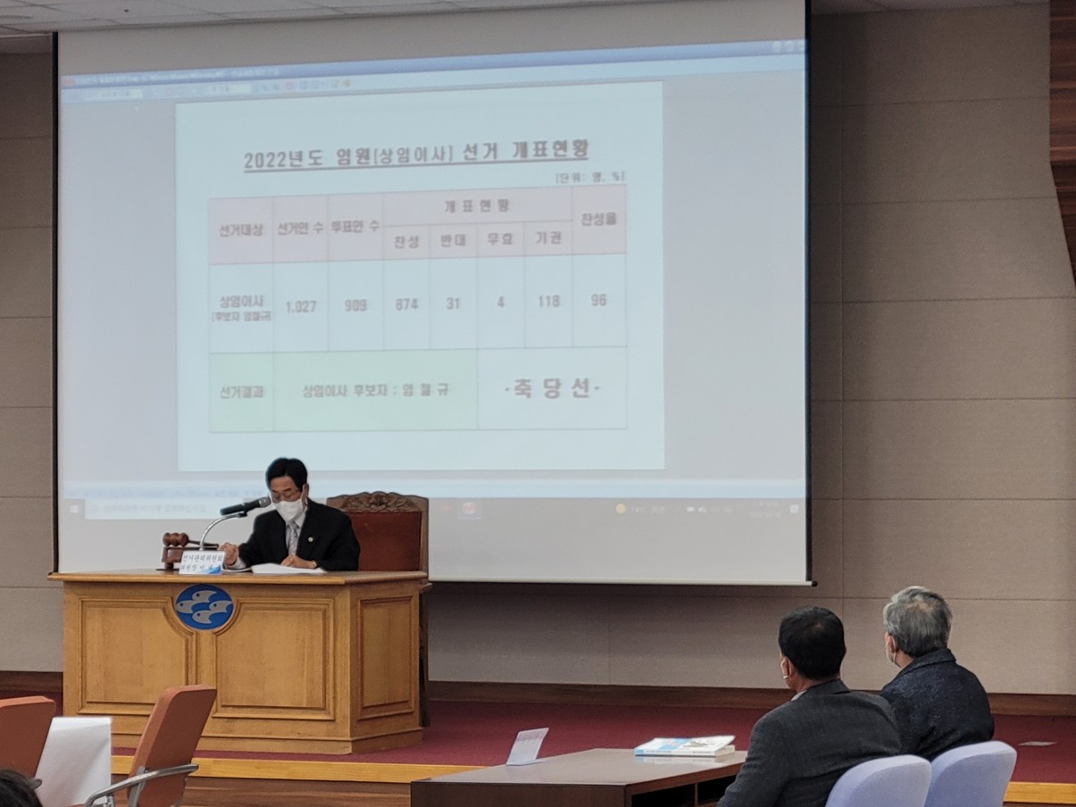 2022. 3. 16(수) 제57기 정기총회에서 경남 및 기타지역을 1선거구로, 전남지역을 2선거구로 나누고 임원선거(상임이사) 투표를 실시한 결과 우리수협 인사추천위원회에서 추천받은 엄철규 지도경제상무가 총 투표수909표 중 찬성874표 반대 31표로 당선되었습니다.