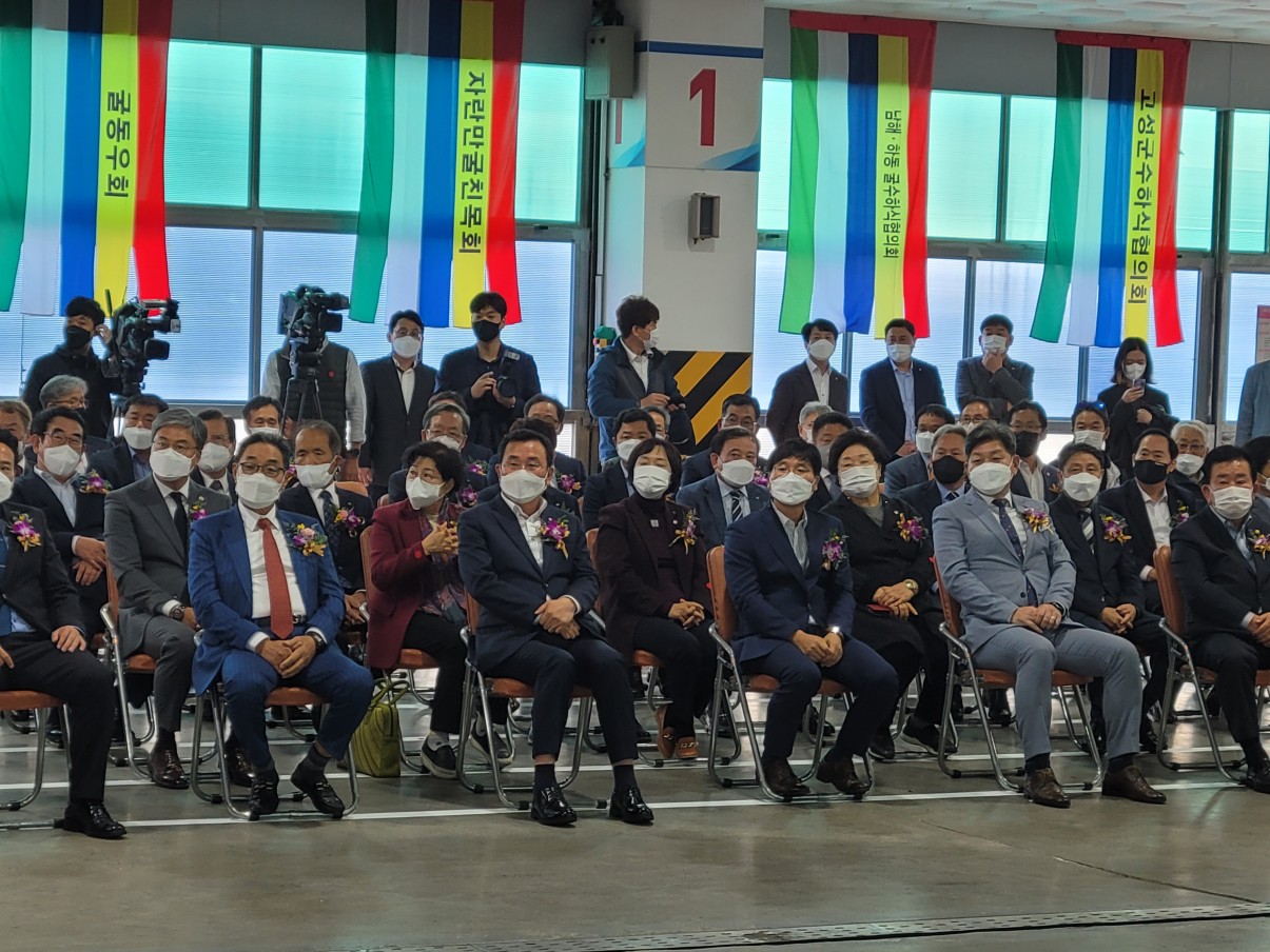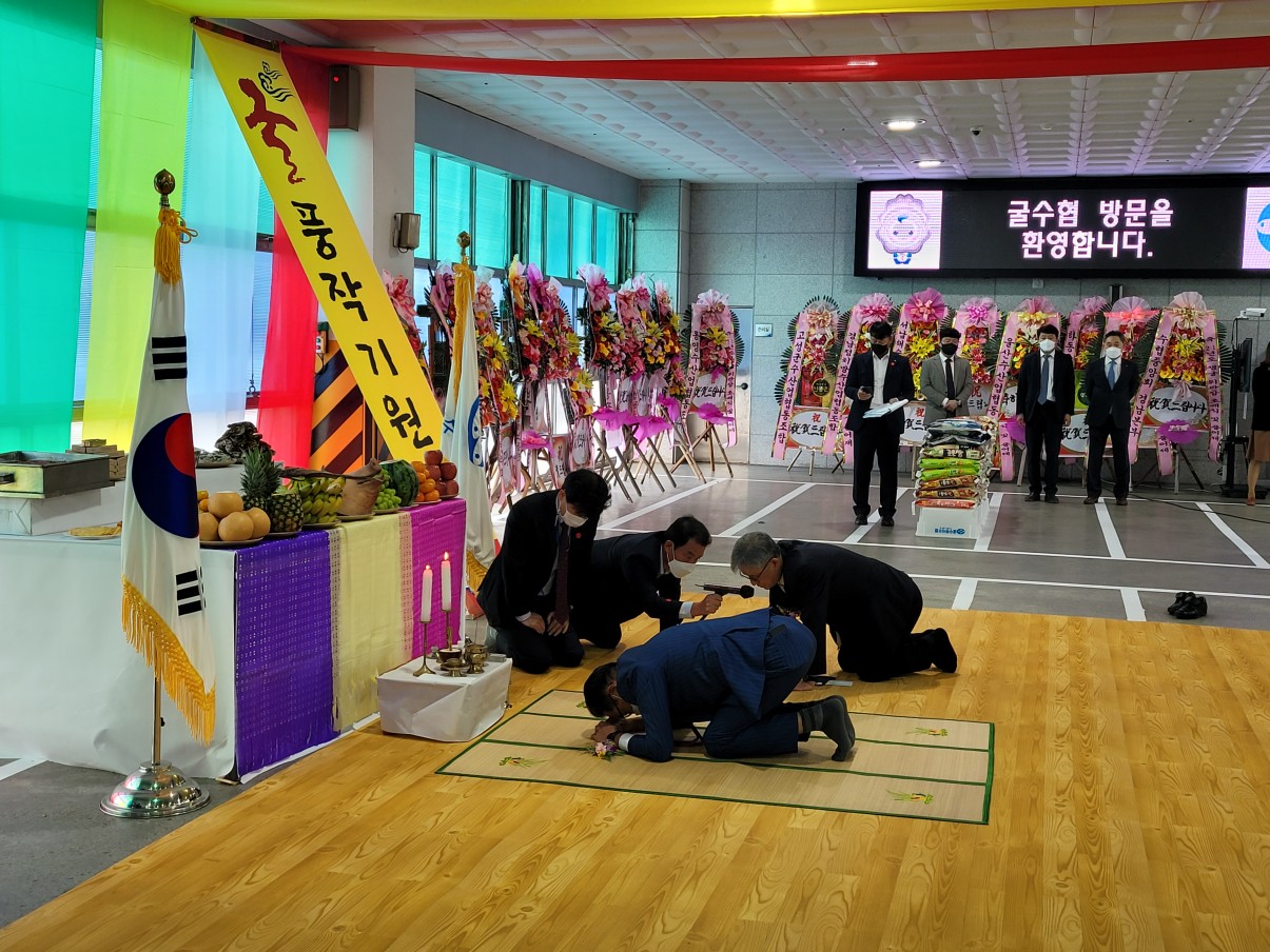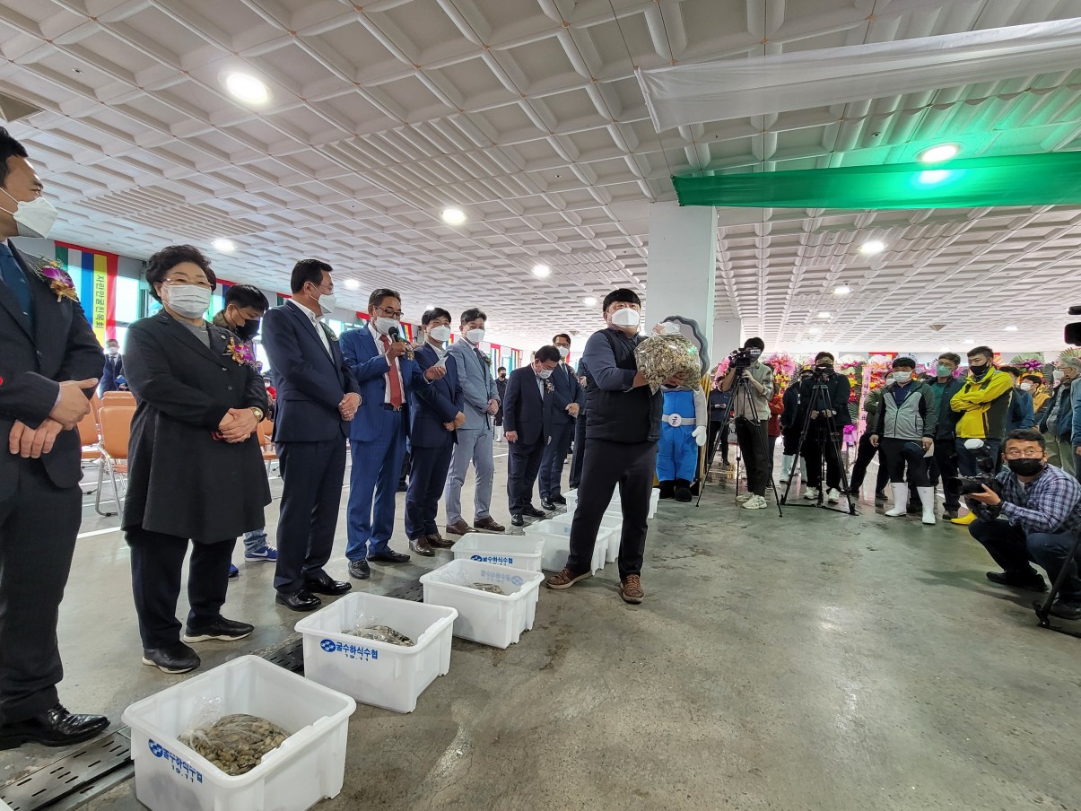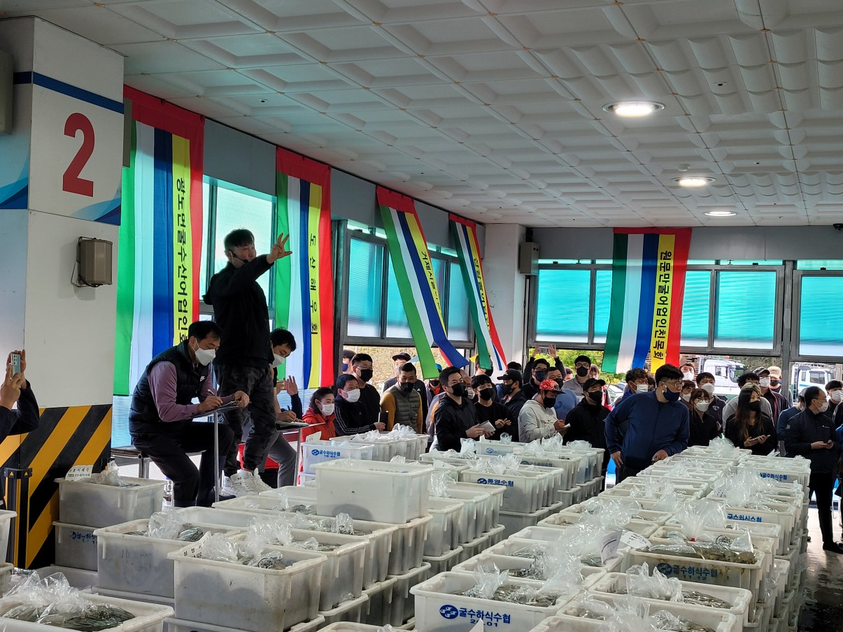 우리수협은 2021.10.21(목) 오후 2시 30분부터 굴산업 발전 및 번영을 기원하는 풍어제(남해안 별신굿 보존회 정영만)를 시작으로 2021년도 생굴(햇굴) 초매식을 통영‧거제시장, 고성군수, 각급 기관단체장, 지역 도‧시 의원 등 50여명을 모시고 개최하며 우수 중·도매인 시상에 이어 주요 내·외빈이 일일 경매사로 나서 2021년도 첫 생굴 시범경매를 하였습니다. 각종 언론 및 방송사가 많은 관심을 가지고 열띤 취재 열기 속에 첫 경매가 시작되었고, 작년 초매식과 대비하여 물량은 15% 감소된 35,190kg, 위판 평균단가는 50% 증가된 키로당 1만6천원선으로 마감을 하였습니다. 이는 여름내 기승을 부린 역대급 폭염으로 굴 성장이 더디어 당장 출하할 물량이 줄어든 데다, 외국인력 수급 차질 등 일손까지 달리면서 생산량이 감소하여 공급 부족으로 이어져 가격이 오른 것으로 판단됩니다.