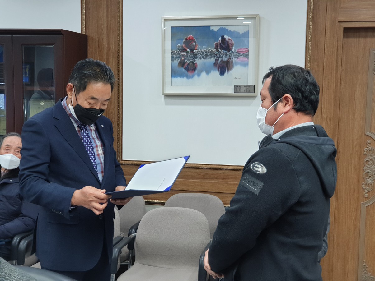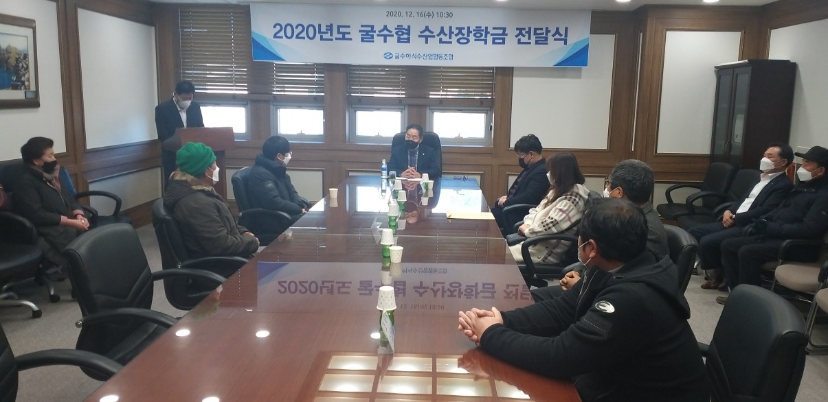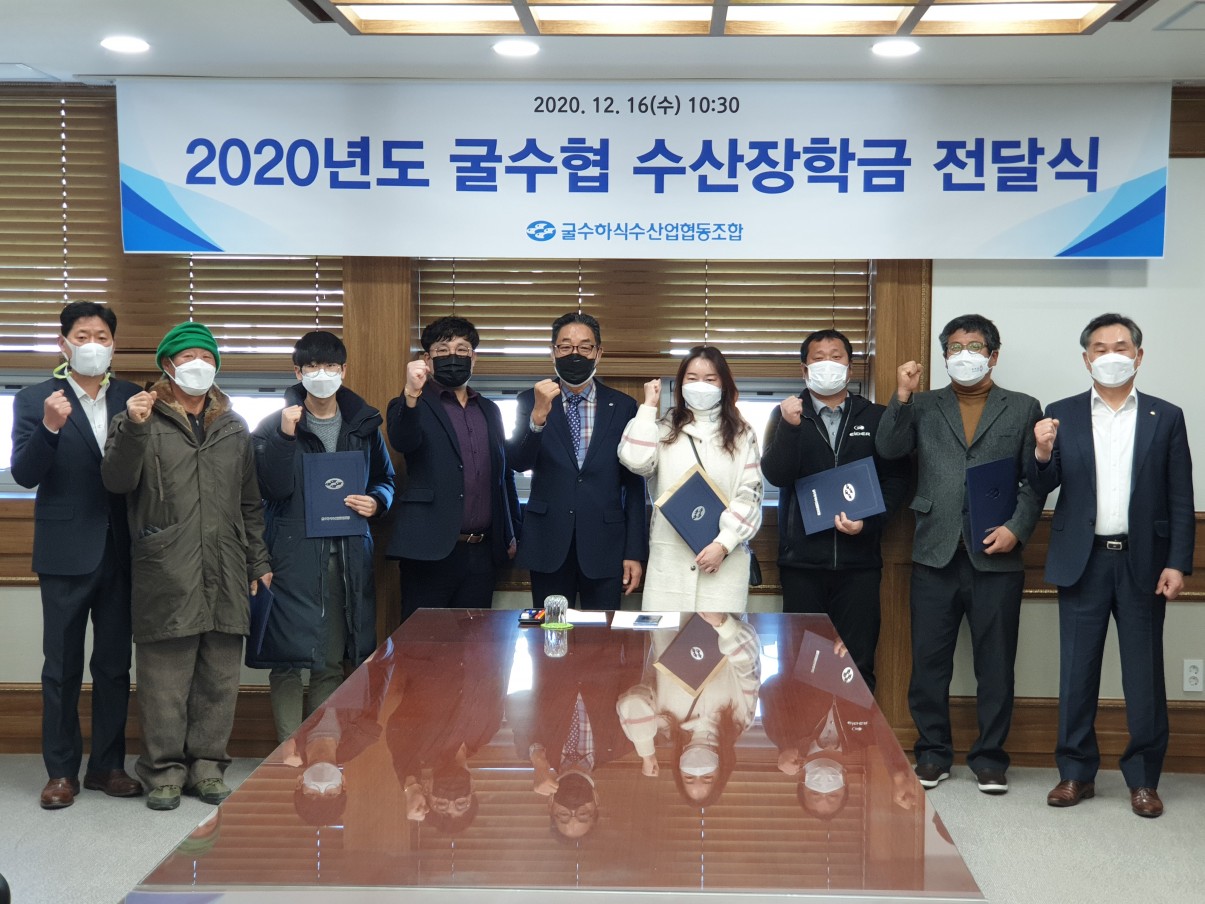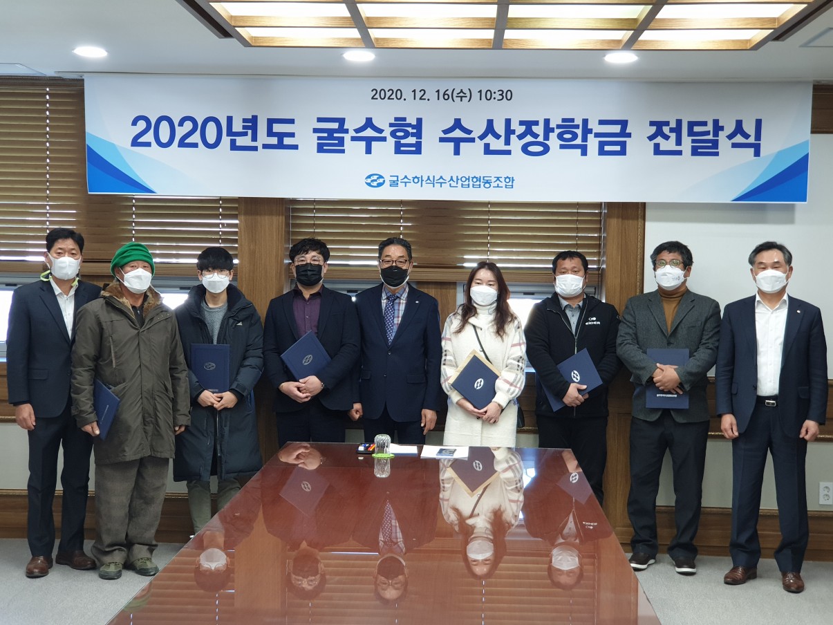 수산업 및 어촌사회에 헌신할 수 있는 유능한 인재를 양성하기 위하여 우리수협 조합원 자녀를 대상으로 한 2020년도 수산장학금 전달식이 2020.12.16.(), 10:30부터 우리수협 소회의실에서 개최되어 고등학생 2박용욱(통영고),문현경(부산국제고)  대학생 4(유수빈(경희대학교),이현진(포항대학교),정유나(이화여자대학교), 조미리(동서대학교)   6명에게 굴수협장 지홍태님이 장학증서와 장학금을 전달하는 뜻깊은 자리가 마련되었습니다.