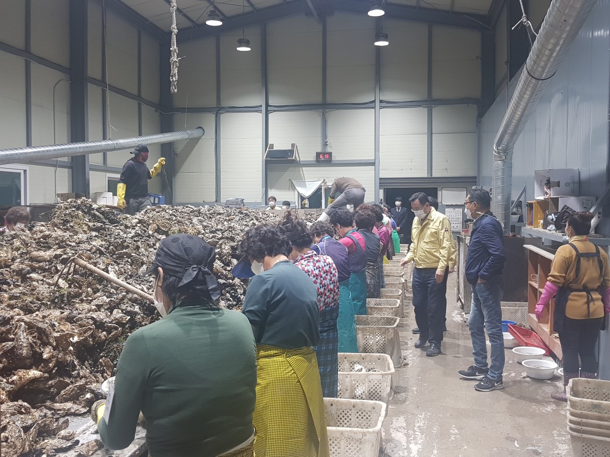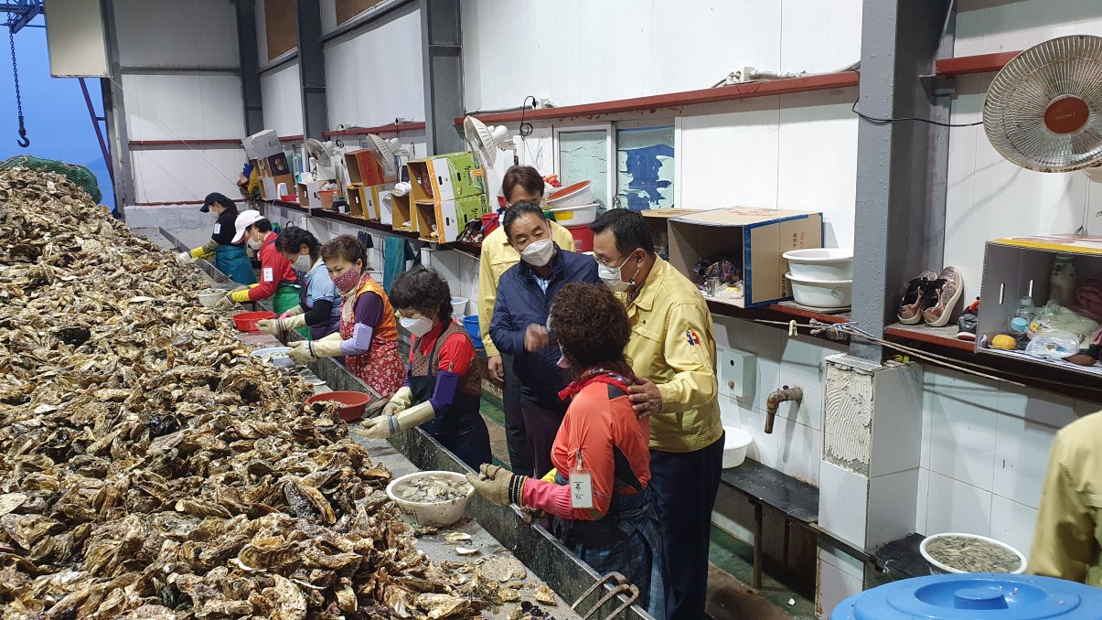 통영시 수산과 직원 및 굴수협 판매과 직원들과 함께 동행한 통영시장님과 굴수협장님은 이른 새벽부터 출근하여 시린 손을 부여잡고 굴까기 작업에 몰두하고 있는 종사자들과 일일이 눈을 맞추고 격려하였으며, 코로나19 확산세를 대비하여 개인위생 및 방역에 철저히 해 줄 것을 당부함과 더불어, 지난 굴까기 어업인 간담회에서 결정된 사항들(오전 작업시간 준수, 마스크 착용 및 손소독 철저, 발열체크 필수 등)을 전달하였습니다.
