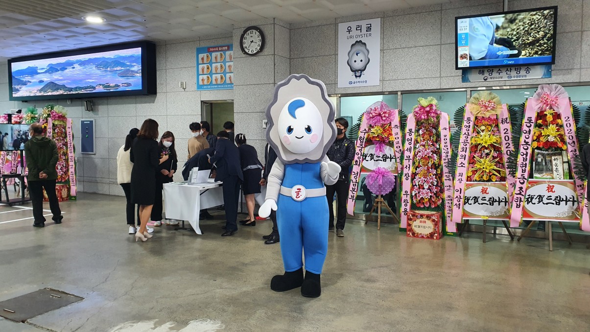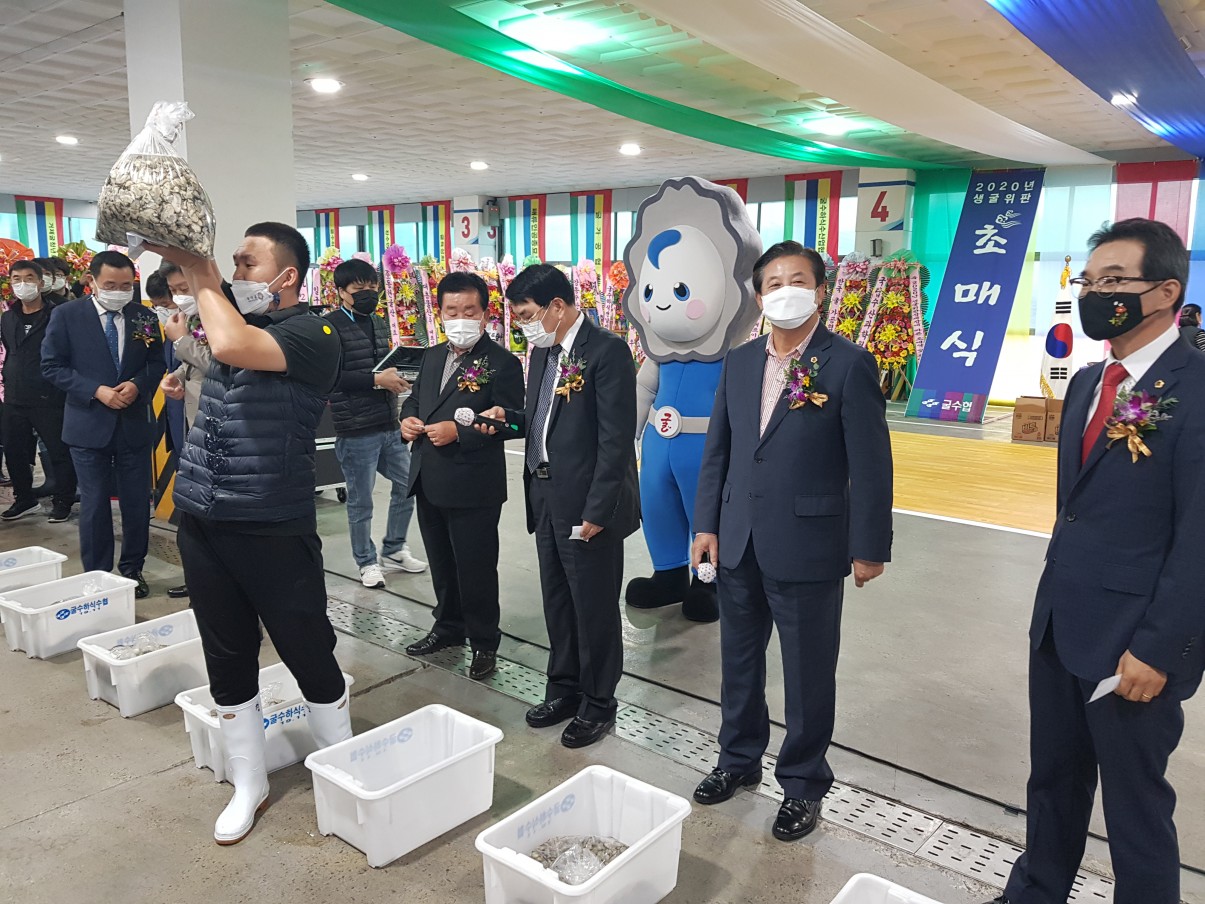 우리수협 위판장 개장 이래 최초로 통영거제고성 지역단체장이 모두 참석하신 금번 초매식 행사에는 강석주 통영시장, 변광용 거제시장, 백두현 고성군수님을 비롯한 통영시의회, 경남도의회, 수협중앙회 및 경남관내 수협장, 통영시 각 기관단체장들과 굴 유통 관계자들도 함께 하여 자리를 빛내 주셨습니다. 풍어제에 이어서 오후 4시부터 시작한 초매식은 내빈소개를 시작으로 매취력 우수중도매인 시상 및 퇴임중도매인에 대한 감사패 전달이 있었으며, 내빈 축사에 이어 고사를 진행하고 마지막으로 시범경매에 이어 5시부터 본 경매를 시작하였습니다. 이날 거래된 물량은 41,650kg으로 평균단가 106천원선에 거래되었습니다. 올해의 생굴 작황은 지난 여름 빈산소수괴(산소부족 물덩어리)현상과 잇단 태풍 등 악조건에도 불구하고 알이 굵고 성장속도도 빨라 품질이 매우 우수할 것으로 예상되며 남해안 청정해역에서 자란 굴을 소비자들이 안심하고 드실 수 있도록 위생관리에 만전을 기할 것입니다.