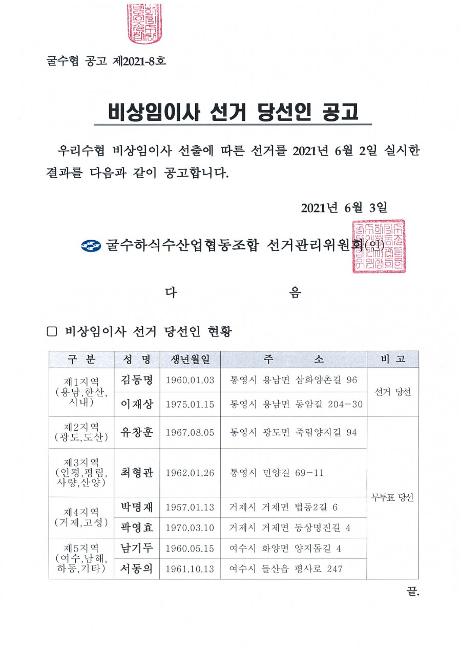 비상임이사 선거 당선인 공고