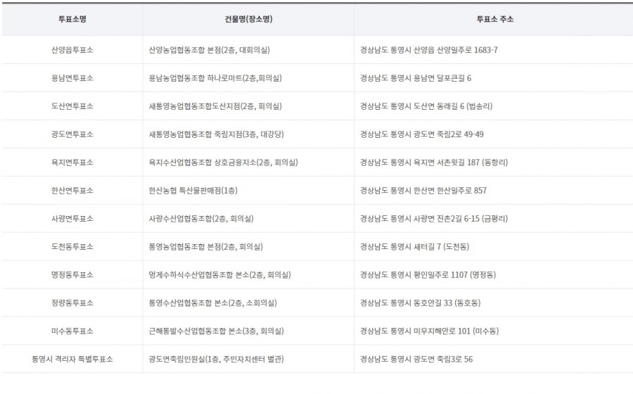 제3회 전국동시조합장선거 굴수협 조합장선거 통영,거제,고성,남해,하동,기타지역 등 투표소 안내