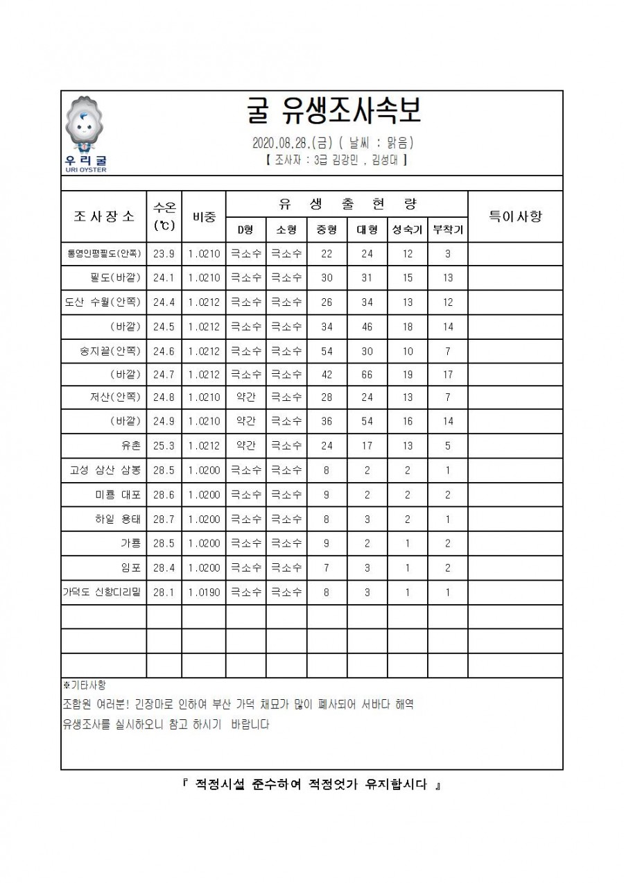 굴 유생조사 속보(2020.08.28)
