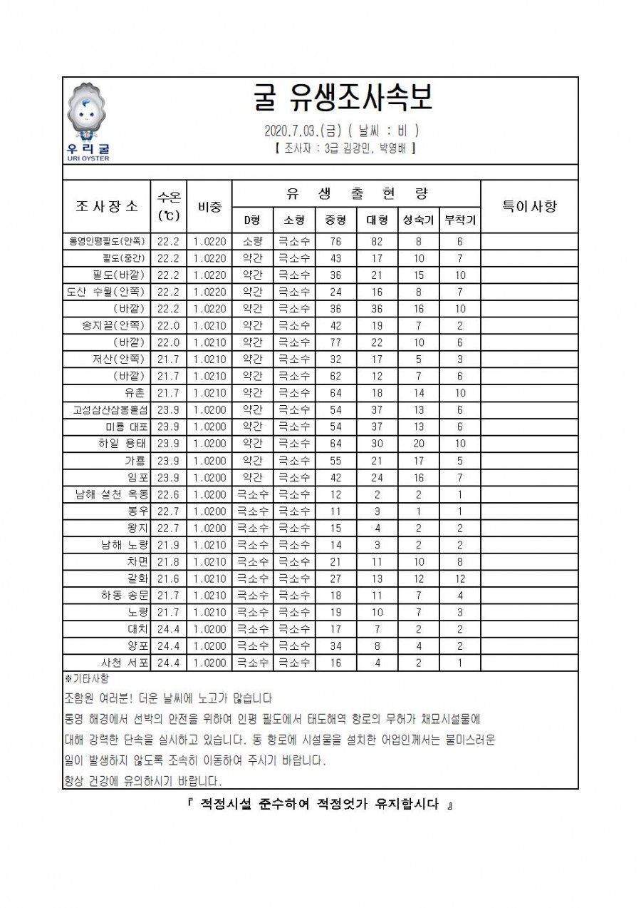 굴 유생조사 속보(2020.07.03)